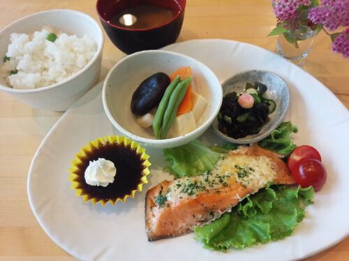 〈5月1日日替わりランチはこちら~!〉 ご 飯 焼き魚 マカロニグラタン 高野豆腐の煮物 酢の物 出し巻卵 新緑で中庭がとてもきれいです!〜皆様のご来店をお待ちしております~