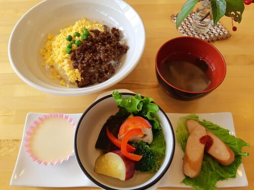 〈11月30日の日替わりランチこちら~!〉 そぼろご飯 焼き野菜のマリネ フランクフルト 胡麻豆腐 773kcal 540円 ~皆様のご来店をお待ちしております~