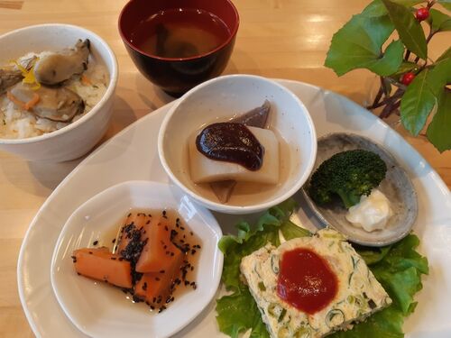 〈1月31日の日替わりランチこちら~!〉 かきご飯 ツナマヨ卵焼き 煮物:柚子味噌かけ 人参の黒ごま酢和え ご飯・お味噌汁 694kcal 540円 ~皆様のご来店をお待ちしております~