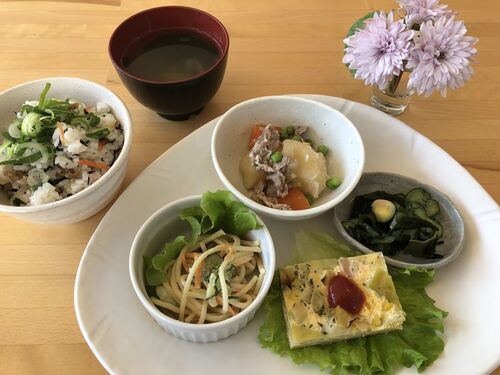 (2月28日のランチメニューはこちら!)・ひじきご飯・サラダ入り卵焼き・スパゲティーサラダ・肉じゃが・酢の物713kcal 600円皆様のお越しをお待ちしております!