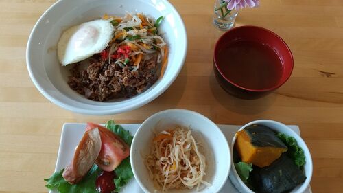 (7月31日日替わりランチこちら~!) ビビンバ丼風 南瓜マリネ トマト 切干大根の煮物 ご飯 味噌汁 822kcal 600円 ~皆様のご来店をお待ちしております~